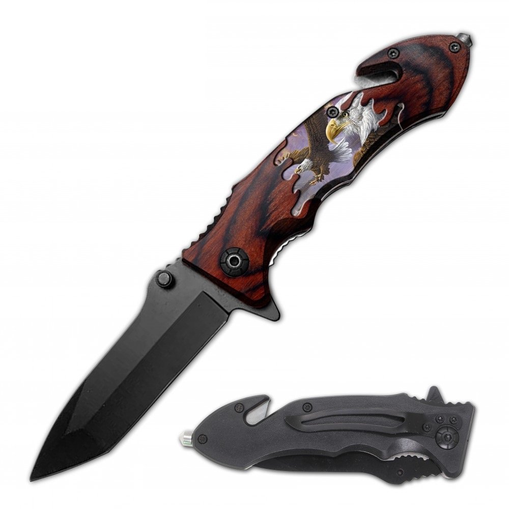 This model of the eagle spring assisted knife, features a eagle image. It features a black stainless steel blade. The handle is made from a sturdy ABS over aluminum, and sports a deep carry pocket clip. Just assist the blade with the thumb stud about 30 degree and watch the spring do the rest. The most sought after feature in this auto-assist knife is the glass breaker for emergency get-a-way and the belt or rope cutter. Includes Black pocket clip.