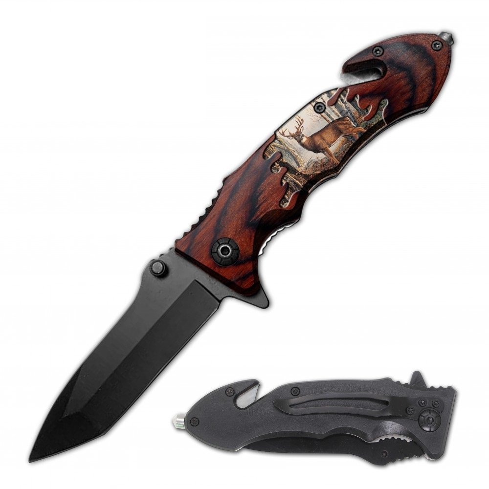 This model of the deer spring assisted knife, features a deer image. It features a black stainless steel blade. The handle is made from a sturdy ABS over aluminum, and sports a deep carry pocket clip. Just assist the blade with the thumb stud about 30 degree and watch the spring do the rest. The most sought after feature in this auto-assist knife is the glass breaker for emergency get-a-way and the belt or rope cutter. Includes Black pocket clip.