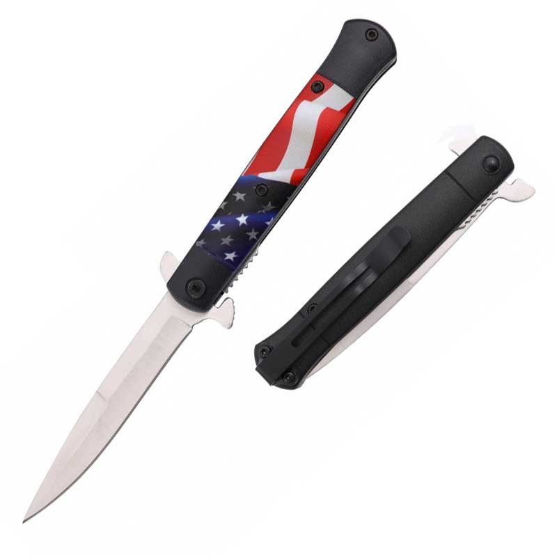 Tactical USA Flag Stiletto Style Spring Assist Opening Pocket Knife
