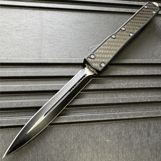 The Tactical OTF Automatic Knife can be deployed and retracted with rapid precision with the slide trigger on the side, giving you a blade that’s up for anything. The dagger blade is two-toned, 440C stainless steel that’s razor-sharp and capable. The blade is housed in an aluminum handle that has carbon fiber insets and features a pocket clip. The handle also features a glass breaker pommel.